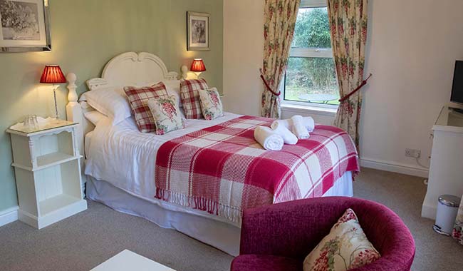 The Rashleigh luxury double room is our largest room with a private en-suite bathroom. The comfortable king size bed is complemented by the shabby chic furniture and 2 cosy tub chairs allow for a relaxing drink before bedtime. A 32 inch internet connected smart television is provided and free wireless internet access is always available. The built-in double wardrobe provides ample storage and last but not least, the luxury en-suite bathroom includes a free-standing slipper bath and separate shower. Room size: 282 sq ft (including en-suite)